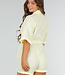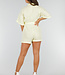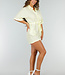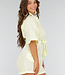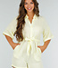 Dieser buttergelbe Playsuit ist aus 100 % Baumwolle mit einer luftigen Musselinstruktur gefertigt. Der Playsuit hat einen klassischen Hemdkragen mit durchgehendem Knopfverschluss vorne. In der Taille befindet sich ein Schleifengürtel aus demselben Stoff, mit dem die Passform angepasst werden kann. Die kurzen Ärmel sind weit und haben einen festen Umschlag. Die Shorts sind locker geschnitten und leicht ausgestellt mit einem festen Saum. Der Baumwollstoff ist nicht dehnbar und fühlt sich leicht und atmungsaktiv an. Ideal für Sommertage.