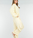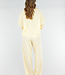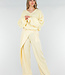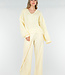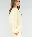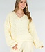 Dieser hellgelbe Pullover hat eine grob gestrickte Struktur mit durchbrochenem Muster. Das Modell hat einen V-Ausschnitt mit geripptem Rand und lange Ärmel. Die Ärmel sind weit geschnitten und mit gerippten Bündchen versehen. Der untere Rand ist mit einem gerippten Saum versehen. Die Passform fällt locker um den Körper und die Länge reicht bis zur Hüfte.