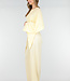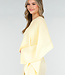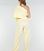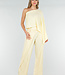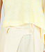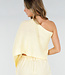 Buttergelbes Oberteil mit One-Shoulder-Ausschnitt und asymmetrischer Passform. Das Modell hat einen langen, weiten Ärmel und eine offene Schulter auf der anderen Seite. Der Stoff fällt geschmeidig und endet knapp über der Hüfte.