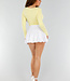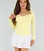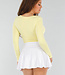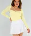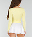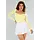 Dieses buttergelbe Oberteil hat eine taillierte Passform und lange Ärmel. Der Ausschnitt hat eine herzförmige Form und ist vorne leicht überschnitten. Der Stoff ist glatt, dehnbar und glänzend. Das Oberteil ist einfarbig ohne Muster oder Aufdrucke und hat einen geraden Saum, der auf der Hüfte endet. Der Rücken hat einen Rundhalsausschnitt.