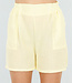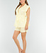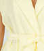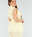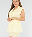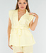 Dieses hellgelbe, zweiteilige Set besteht aus einem ärmellosen Blazer-Oberteil mit Reverskragen und tiefem V-Ausschnitt, kombiniert mit einer Shorts mit hoher Taille. Das Oberteil wird mit einem passenden Schleifengürtel geschlossen und hat zwei dekorative Pattentaschen und eine dekorative Brusttasche ohne Verschluss. Die Shorts haben einen elastischen Bund. Der Stoff fühlt sich weich und luftig an. Perfekt für einen Abend oder einen lässigen Tagesausflug.