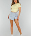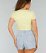 Dieses hellgelbe Basic-Cropped-Top ist aus einem dehnbaren Stoff mit doppeltem Futter auf der Vorderseite gefertigt, das für zusätzliche Festigkeit und Abdeckung sorgt. Es hat kurze Ärmel, einen Rundhalsausschnitt und eine figurbetonte Passform. Dank des Stretchanteils liegt das Oberteil eng am Körper an und bleibt bequem. Für einen sommerlichen Look lässt es sich gut mit hohen Jeans oder lockeren Leinenhosen kombinieren.