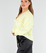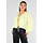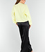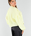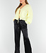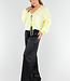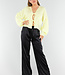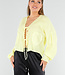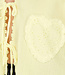 Diese Bluse ist einfarbig buttergelb und hat eine lockere, gerade Passform. Der Stoff ist leicht zerknittert. Auf der Vorderseite befinden sich zwei dekorative herzförmige Taschen mit Häkelbesatz und kleinen Stickereien. Die Bluse wird mit zwei schmalen Bändern geschlossen, die gebunden werden können, und hat einen tiefen V-Ausschnitt. Die Ärmel sind lang und weit mit gerafften, elastischen Bündchen, die mit gehäkelter Spitze abschließen.