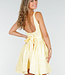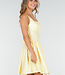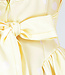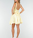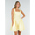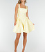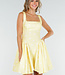 Dieses buttergelbe Kleid mit weißen Tupfen ist aus einem glatten Stoff mit Stretchanteil gefertigt und hat einen ausgestellten Rockteil. Das Mieder hat breite Schulterträger, einen quadratischen Ausschnitt und weiche, eingesetzte Polster. Das Kleid wird am Oberkörper geschlossen und hat einen verdeckten Reißverschluss am Rücken. In der Taille befindet sich ein breites Band, das im Rücken geschnürt wird.