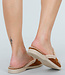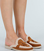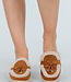 Diese kamelfarbenen Slipper sind aus einem Material in Wildlederoptik mit einem weichen Teddy-Finish an den Rändern gefertigt. Die Innenseite ist vollständig mit dem gleichen Teddy-Stoff gefüttert, was für zusätzliche Wärme und Tragekomfort sorgt. An der Vorderseite befindet sich ein dekoratives Band mit goldfarbenen Details. Die Sohle ist flach und leicht, wodurch der Schuh bequem zu tragen ist. Die abgerundete Spitze und die weiche Innenseite machen diese Slipper ideal für den täglichen Gebrauch an kühleren Tagen.