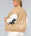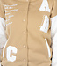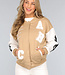 Diese Strickjacke ist innen aus einem weichen Fleecestoff und hat einen Baseball-Stil. Sie hat lange Ärmel und einen Rundhalsausschnitt. Auf der Vorderseite befindet sich ein Knopfverschluss, der aus sieben Druckknöpfen besteht. Am Ende der Ärmel, am Halsausschnitt und an der Unterseite der Jacke befindet sich ein elastischer Saum. Die Weste hat zwei Seitentaschen und ist mit verschiedenen Aufnähern und Texten versehen.