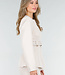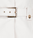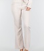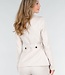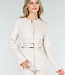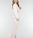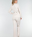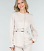 Dieses 2-teilige Set besteht aus einem cremefarbenen Blazer und einer passenden Hose aus glattem, gewebtem Stoff. Der Blazer hat einen Rundhalsausschnitt ohne Revers und ist mit dezenten Schulterpolstern für eine strukturierte Passform versehen. Der Blazer wird mit Druckknöpfen geschlossen und hat an der Taille einen breiten Gürtel mit Metallschnallen. Die Hose ist hoch tailliert und hat gerade Hosenbeine.