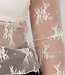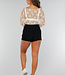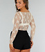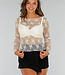 Dieses cremefarbene Oberteil ist aus transparentem Mesh mit einer Spitzenstruktur und einem ruhigen Blumendruck auf dem gesamten Oberteil. Der Stoff ist dehnbar und liegt eng am Körper an. Es hat lange Ärmel und einen Bootsausschnitt. Die Kombination aus transparentem Stoff und dezentem Druck macht dieses Oberteil perfekt für jede Gelegenheit.