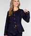 Dieser dunkelblaue Denim-Blazer ist aus robustem Jeansstoff gefertigt und hat eine taillierte Passform mit einem dezenten Schößchen am Saum. Der Blazer hat lange Ärmel, einen Rundhalsausschnitt und goldfarbene Knöpfe auf der Vorderseite. Die sichtbaren Nähte und zwei dekorative Seitentaschen sorgen für einen klassischen Denim-Look. Auf der Rückseite befindet sich ein kleiner Schlitz für zusätzliche Bewegungsfreiheit. Kombinieren Sie ihn mit der passenden Hose zu einem kompletten Set.