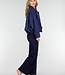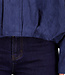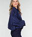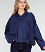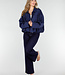 Diese dunkelblaue Jacke ist aus einem weichen Stoff in Wildlederoptik gefertigt. Das Modell hat eine gerade, locker fallende Passform mit abgesenkten Schulternähten und langen Ärmeln. Der Verschluss an der Vorderseite besteht aus einem Reißverschluss und einem zusätzlichen Überwurf mit Knöpfen. An den Schultern sind Schulterklappen angebracht. Der Saum ist elastisch verarbeitet, sodass die Jacke schön an der Hüfte anliegt.