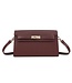 Diese dunkelbraune Umhängetasche ist aus einem strukturierten Material in Lederoptik gefertigt und hat eine rechteckige Form. Die Tasche hat eine Größe von 27 x 16 x 7 cm und ein Gewicht von 0,52 kg. Auf der Vorderseite befindet sich eine schmale Klappe mit goldfarbenem Drehverschluss, der für einen sicheren Verschluss sorgt. Der abnehmbare und verstellbare Schultergurt ermöglicht es, die Tasche sowohl quer über den Körper als auch über der Schulter zu tragen. Die sauberen Nähte und das minimalistische Design verleihen der Tasche ein elegantes Aussehen, während die goldfarbenen Akzente für ein subtiles Detail sorgen.