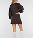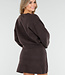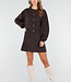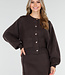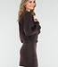 Dieses dunkelbraune 2-teilige Set besteht aus einer Strickjacke und einem passenden Rock. Die Strickjacke hat einen Rundhalsausschnitt, lange Ärmel und glänzende Knöpfe auf der Vorderseite. Außerdem sind zwei große aufgesetzte Taschen auf der Vorderseite zu sehen. Der Rock ist kurz geschnitten, figurbetont und hat einen elastischen Bund, der für einen bequemen Sitz sorgt. Beide Teile sind aus einem weichen Strickstoff gefertigt und haben dezente, sichtbare Nähte an den Seiten. Das Set kann sowohl zusammen als auch separat getragen werden.