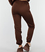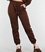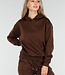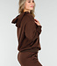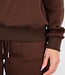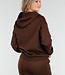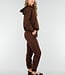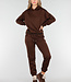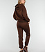 Dieses dunkelbraune Jogging-Set besteht aus einem Hoodie und einer passenden Hose. Der Hoodie hat eine Kapuze mit Kordelzug und lange Ärmel mit Bündchen. Die Hose hat einen elastischen Bund mit Kordelzug und gerade Beine mit konisch zulaufendem Saum. Das Set ist aus einem weichen, bequemen Stoff gefertigt und fällt geschmeidig um den Körper.