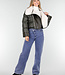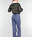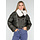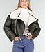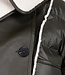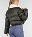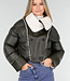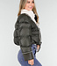 Diese kurze Steppjacke ist aus einem glänzenden dunkelgrünen Stoff gefertigt. Die Jacke hat einen breiten Kragen im Teddy-Look und wird vorne mit einer doppelten Knopfleiste geschlossen. Die Ärmel sind lang und mit breiten Manschetten versehen. An den Seiten befinden sich zwei Seitentaschen. Das Modell fällt gerade und endet an der Taille.