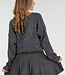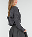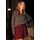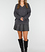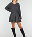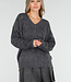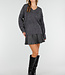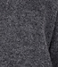 Dieser Pullover ist aus einem dunkelgrauen melierten Stoff gefertigt. Er hat eine gerade, lockere Passform mit V-Ausschnitt und langen Ärmeln. Der Stoff hat eine flauschige, wollartige Struktur mit feiner Strickoptik. Die Ärmelenden und der Saum sind leicht gerippt.