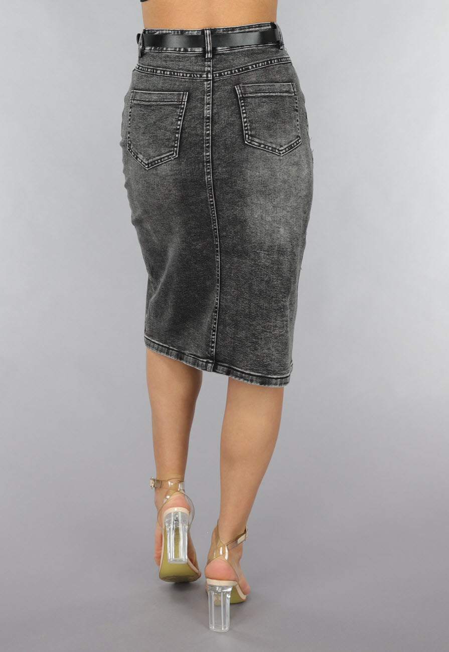 Anthrazitfarbener Denim-Midirock mit Gürtel