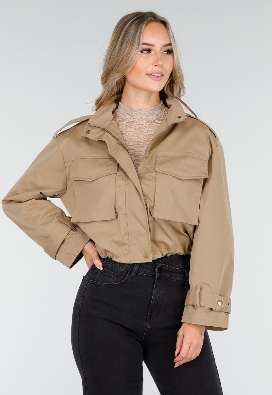 Beigefarbene kurze Jacke mit Taschendetails