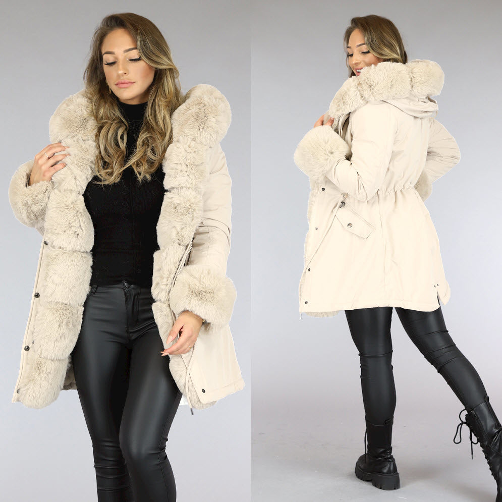 Beigefarbener mit Kunstfell gefütterter Wintermantel