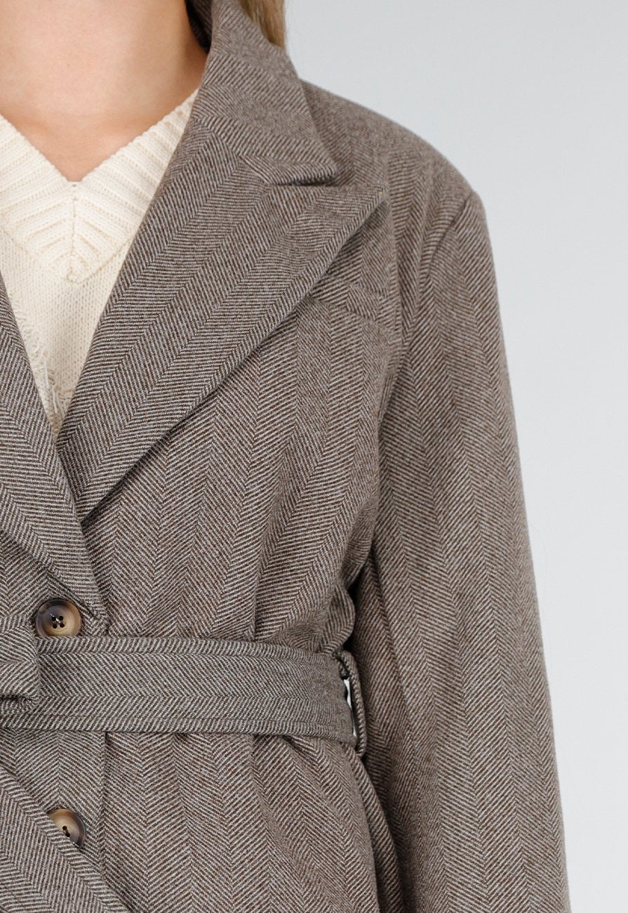 Diese kurze Jacke ist aus einem braunen Wollstoff mit dezentem Fischgrätenmuster gefertigt. Das Modell hat einen klassischen Reverskragen und eine doppelte Knopfleiste auf der Vorderseite. Der Gürtel aus dem gleichen Stoff kann gebunden werden, um die Taille zu betonen. Die Ärmel sind mit Knopfdetails an den Manschetten versehen.