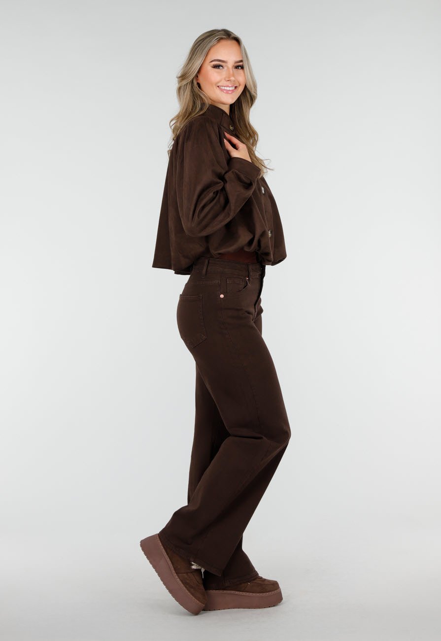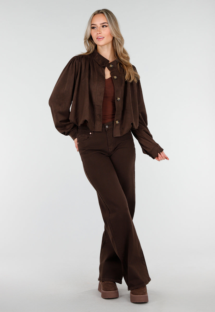 Diese dunkelbraune Jacke ist aus einem weichen Stoff in Wildlederoptik gefertigt. Das kurze Modell hat einen Knopfverschluss, eine gerade Passform mit leicht strukturierten Schultern und dezenten Puffärmeln, die in breiten Manschetten mit Knopfverschluss enden. Die Jacke hat einen Stehkragen und eine glatte Innenseite für hohen Tragekomfort.