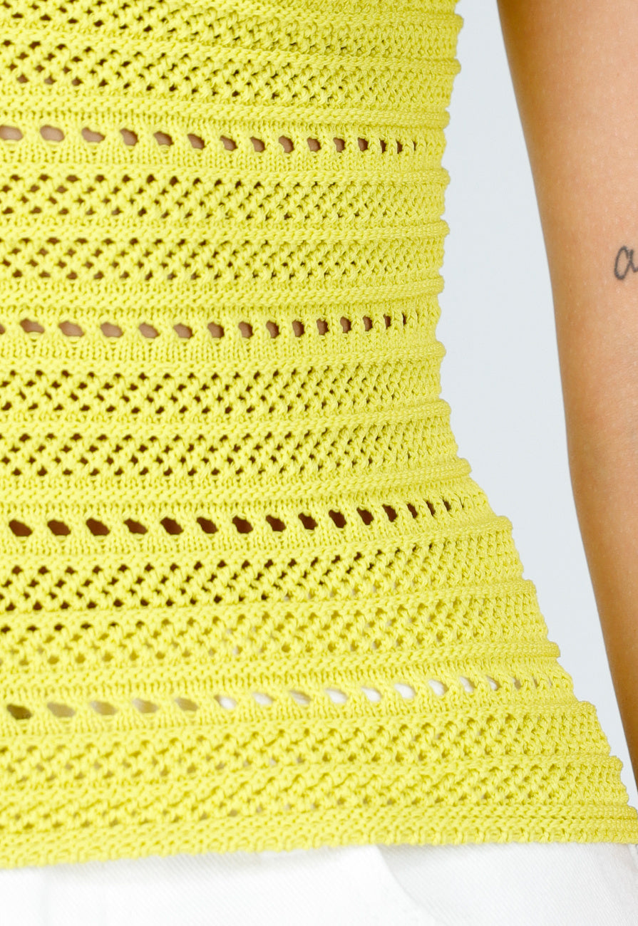 Dieses gehäkelte Halstertop in Gelb hat eine eng anliegende Passform und wird im Nacken gebunden. Das durchbrochene Muster verläuft horizontal über das gesamte Oberteil und lässt die Haut dezent durchscheinen. Das gehäkelte Material macht das Teil dehnbar und geschmeidig in der Textur.