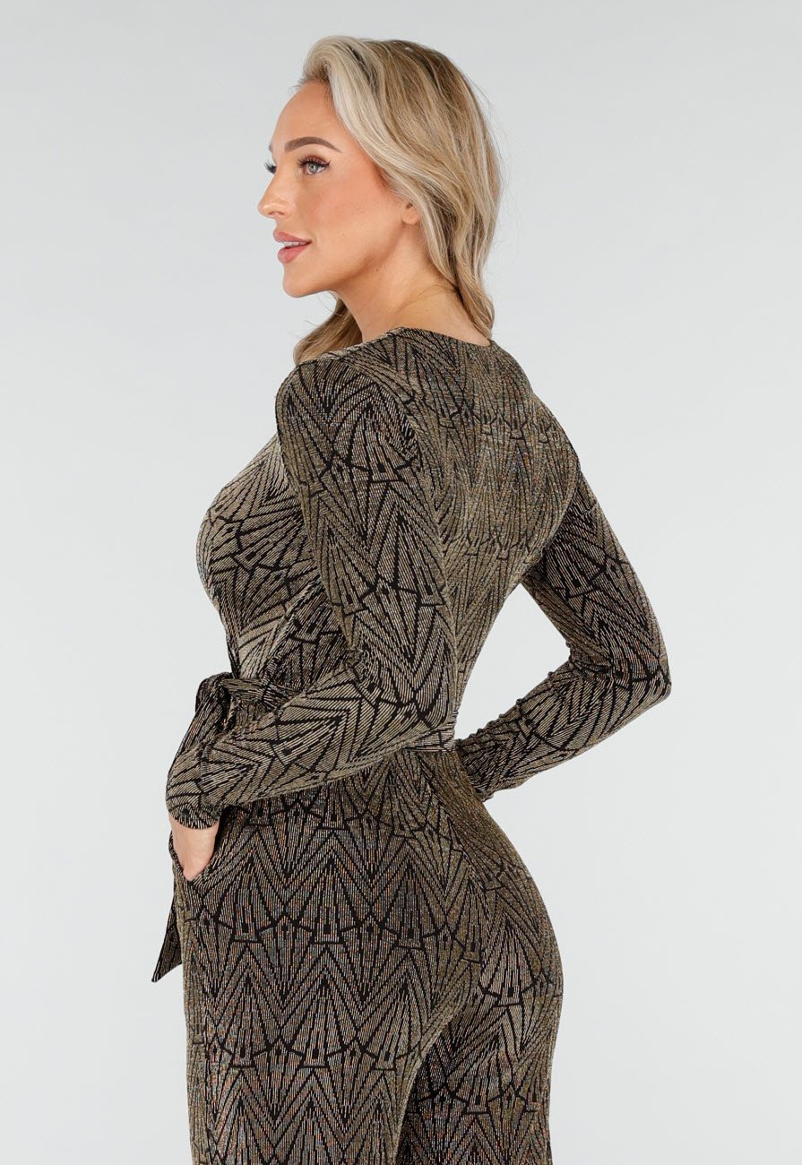 Dieser Jumpsuit mit goldenem Glitzerprint ist aus einem bequemen Stretchstoff gefertigt und hat lange Ärmel. Das Modell hat einen V-Ausschnitt, einen abnehmbaren Gürtel in der Taille und gerade Hosenbeine.