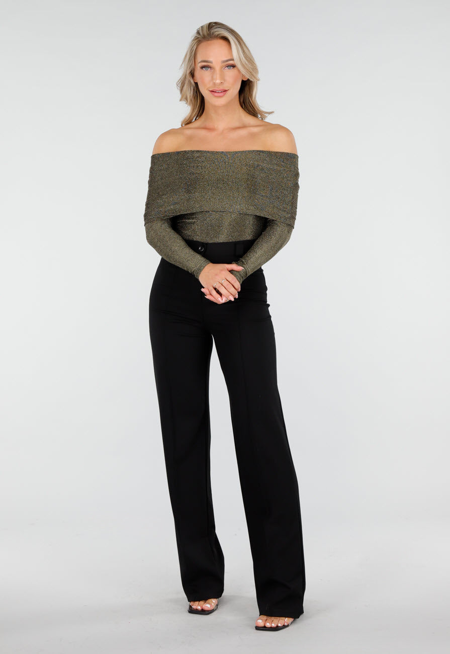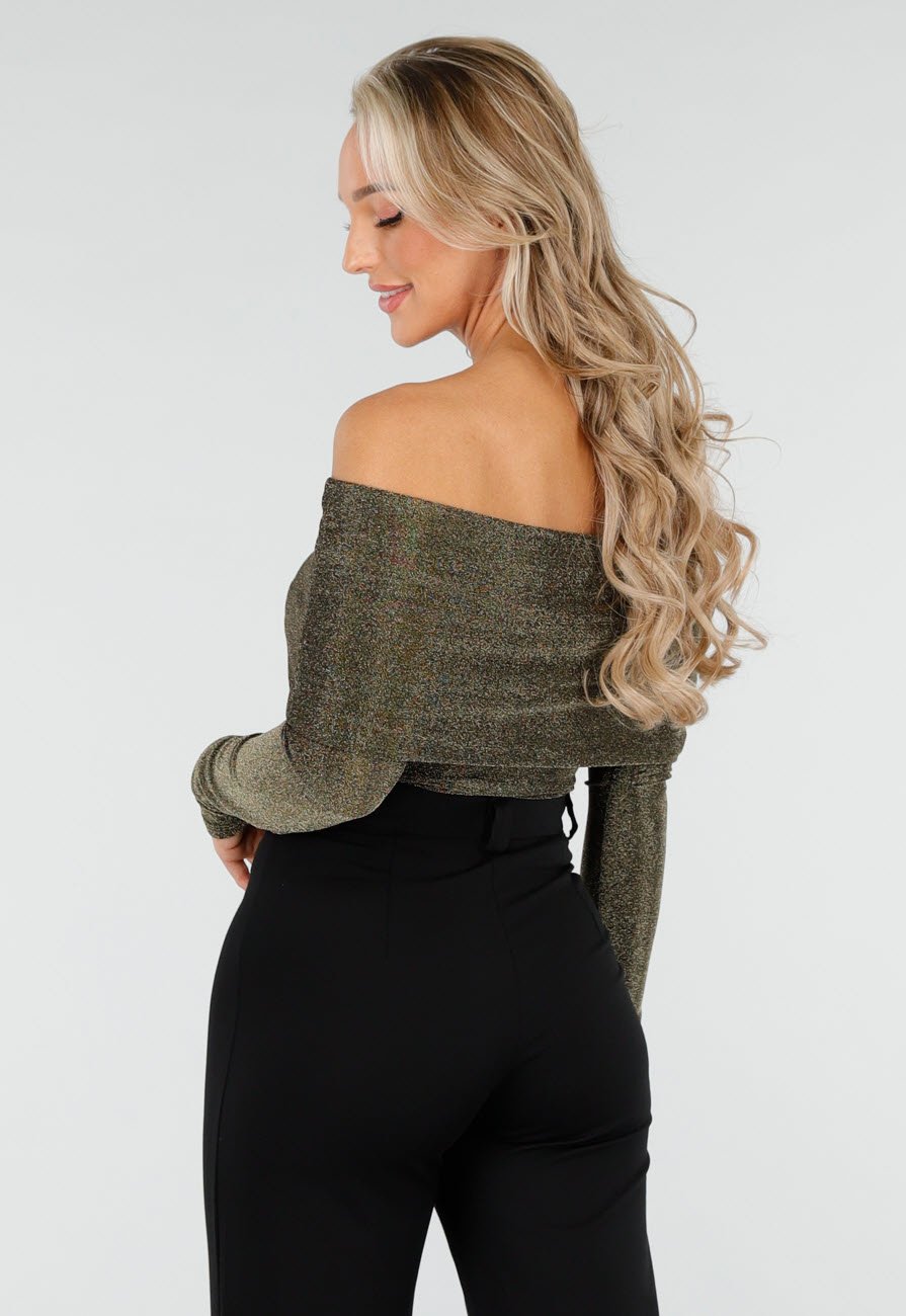 OP=OP.AV.12 Gouden Stretch Off Shoulder Glitter Top Größe S