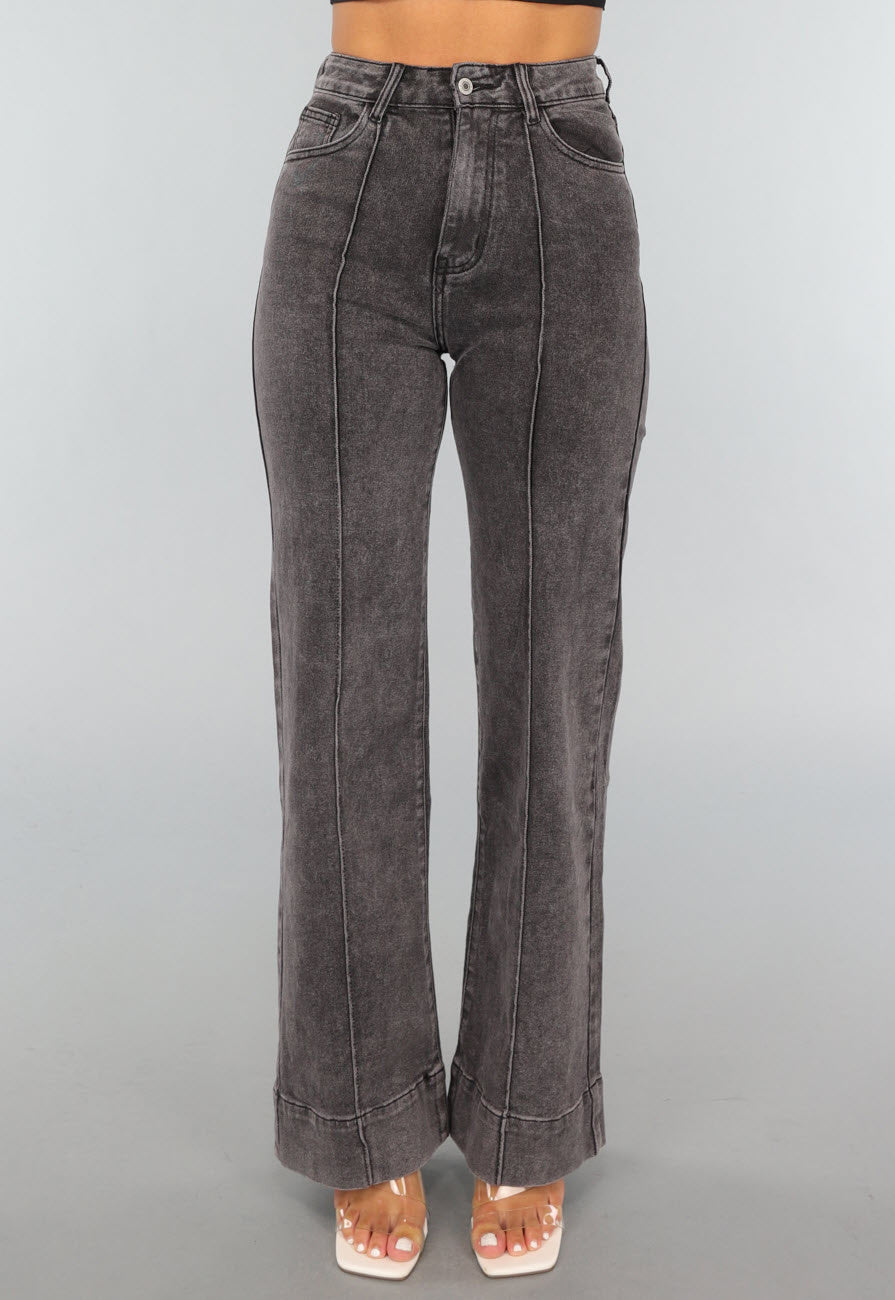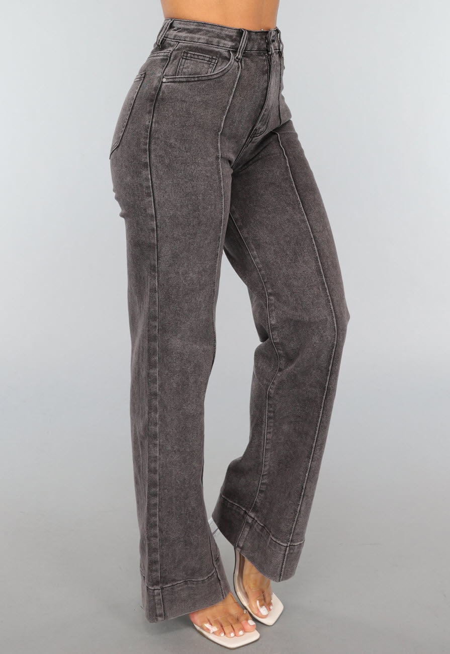 Diese Jeans ist aus Baumwolle gefertigt und hat einen geraden Beinschnitt. Sie hat einen Reißverschluss und einen Knopfverschluss auf der Vorderseite. Die Jeans hat zwei Seitentaschen auf der Vorderseite und zwei Gesäßtaschen auf der Rückseite. Um die Taille herum befinden sich fünf Gürtelschlaufen. Die Jeans hat eine hohe Taille und ist dehnbar.
