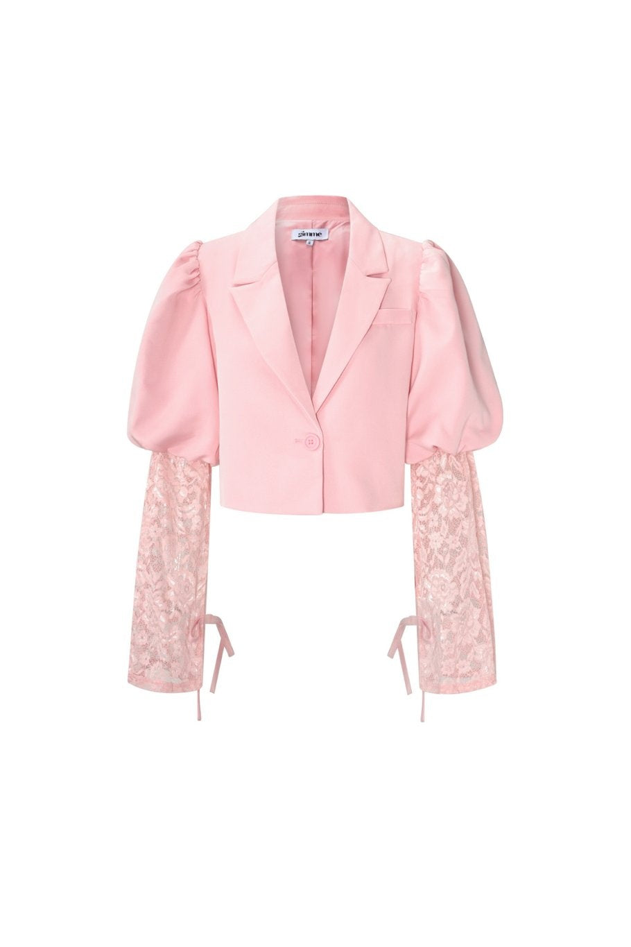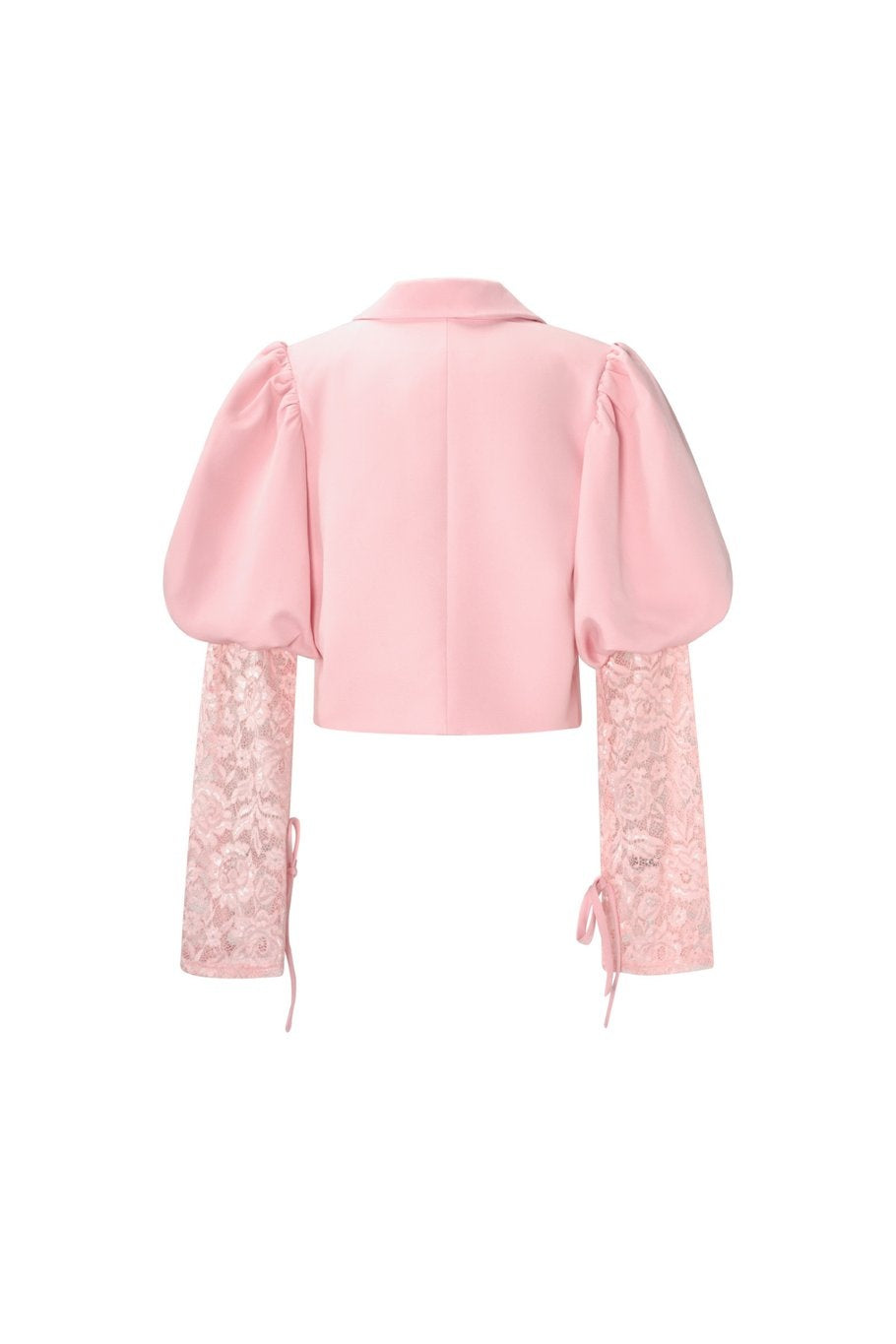 Dieser hellrosa Kurzblazer ist mit einem einzigen Knopf zu schließen und hat einen tiefen Reverskragen. Die Schultern haben Volumen mit auffälligen Falten, die einen Puff-Effekt erzeugen. Die Ärmel enden in einer kontrastierenden Spitzenpartie im gleichen Rosa-Ton. Die Spitzenabschlüsse sind am Handgelenk mit einer Satinschleife verschlossen. Der Blazer ist ungefüttert und hat eine gerade, kurze Passform bis zur Taille.