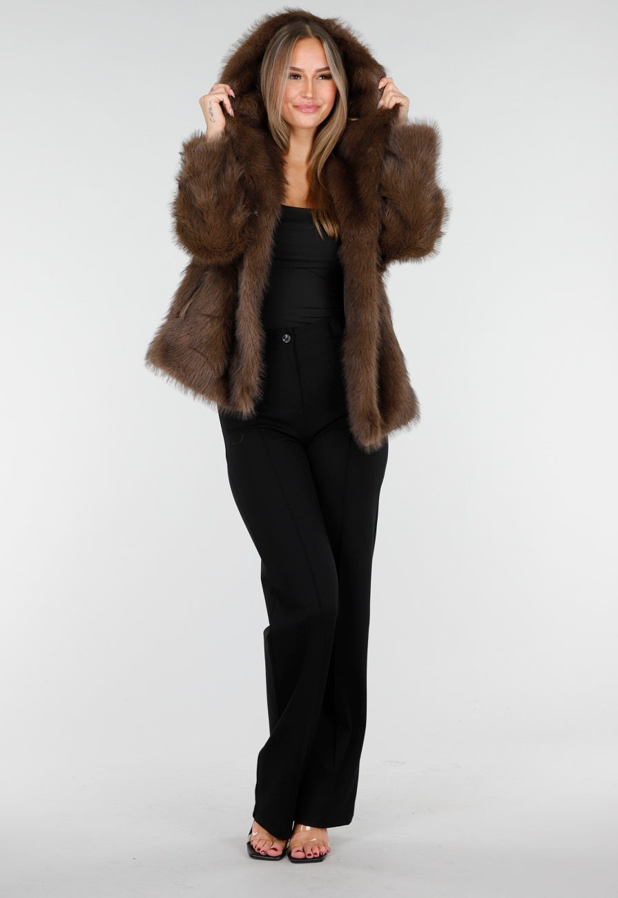 Diese Jacke ist aus braunem Kunstfell gefertigt und hat eine weiche, voluminöse Struktur. Das Modell verfügt über eine Kapuze und lange Ärmel. Die Jacke wird vorne mit mehreren Hakenverschlüssen geschlossen, die dezent in den Stoff eingearbeitet sind. Die Länge reicht bis knapp über die Hüfte und der untere Saum ist gerade geschnitten.