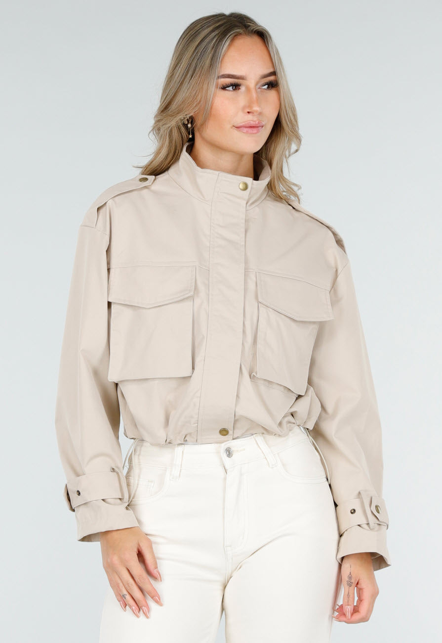 Diese hellbeige kurze Jacke hat einen geraden Schnitt und ist aus einem robusten Stoff gefertigt. Das Modell hat zwei große aufgesetzte Brusttaschen mit Patte, einen durchgehenden Reißverschluss und verstellbare Manschetten mit Knopfverschluss. Die Jacke hat Schulterklappen und eine kurze Länge, die knapp über der Hüfte endet. An der Unterseite befindet sich ein sichtbarer Kordelzug, mit dem die Passform angepasst werden kann. Der Kragen ist hochgeschlossen und verleiht der Jacke einen coolen Charakter.