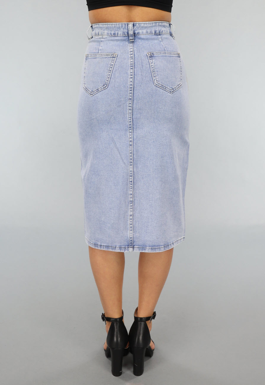 Dieser Rock ist aus robustem Denim-Stoff gefertigt. Er hat einen Midi-Schnitt, das heißt, er fällt bis unter das Knie. Vorne hat er einen schönen Schlitz und wird mit einem Reißverschluss in Kombination mit einem einzelnen Knopf geschlossen. Auf der Vorderseite hat er zwei Einschubtaschen und auf der Rückseite hat er zwei Gesäßtaschen. Er hat eine schöne Beschichtung auf der Vorderseite für einen glänzenden Look.