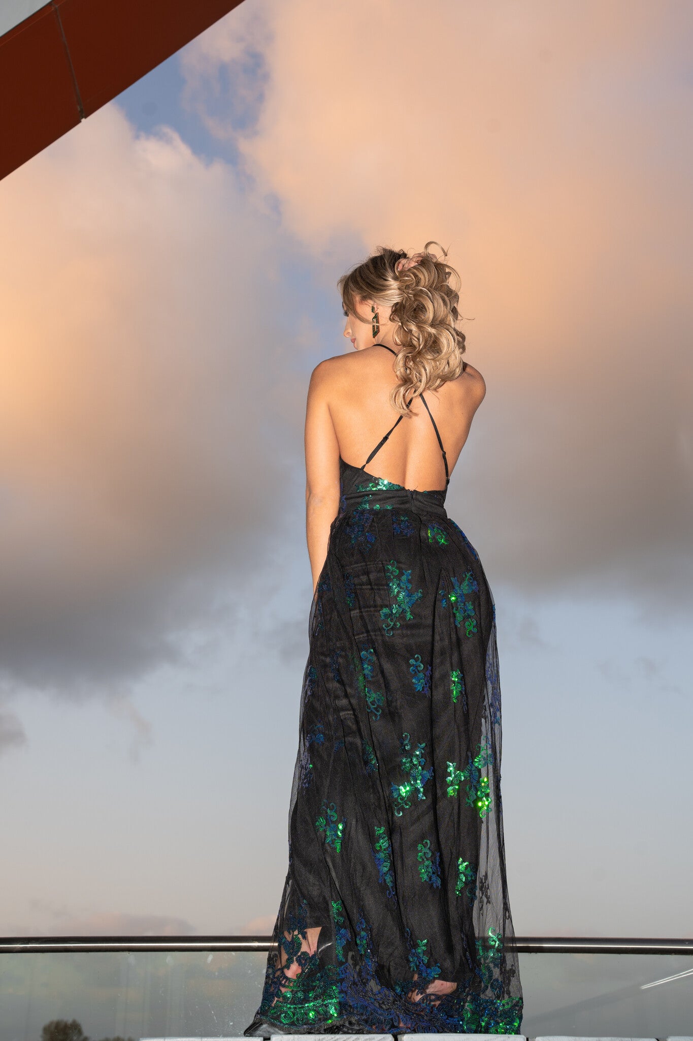 Dieses schwarze Galakleid hat einen Mesh-Overlay, der mit grünen Pailletten besetzt ist. Diese Pailletten verlaufen in einem dekorativen Muster über das Kleid. Es hat einen tiefen V-Ausschnitt und verstellbare Schulterträger, die sich im Rücken kreuzen. Am Rücken befindet sich ein verdeckter Reißverschluss. Das Kleid sitzt oben gut und ist unten locker. Vorne hat der Unterrock zwei hohe Schlitze. Dieses schöne Kleid enthält Stretch.