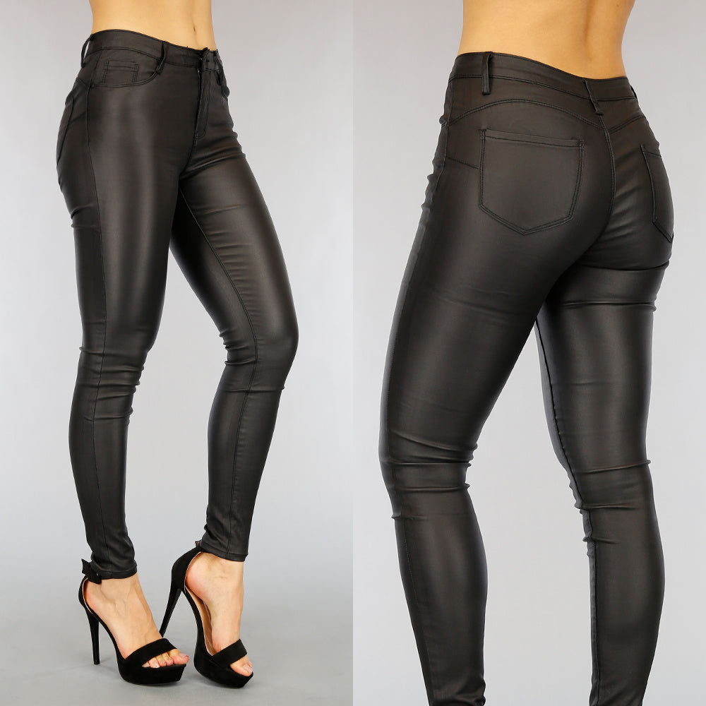 Schlagwörter: Skinny Leder-Look Mid Waist Hose, schwarze Leder Push-up Jeans, tailliert, Stretch, mittlere Taille, Leder-Look