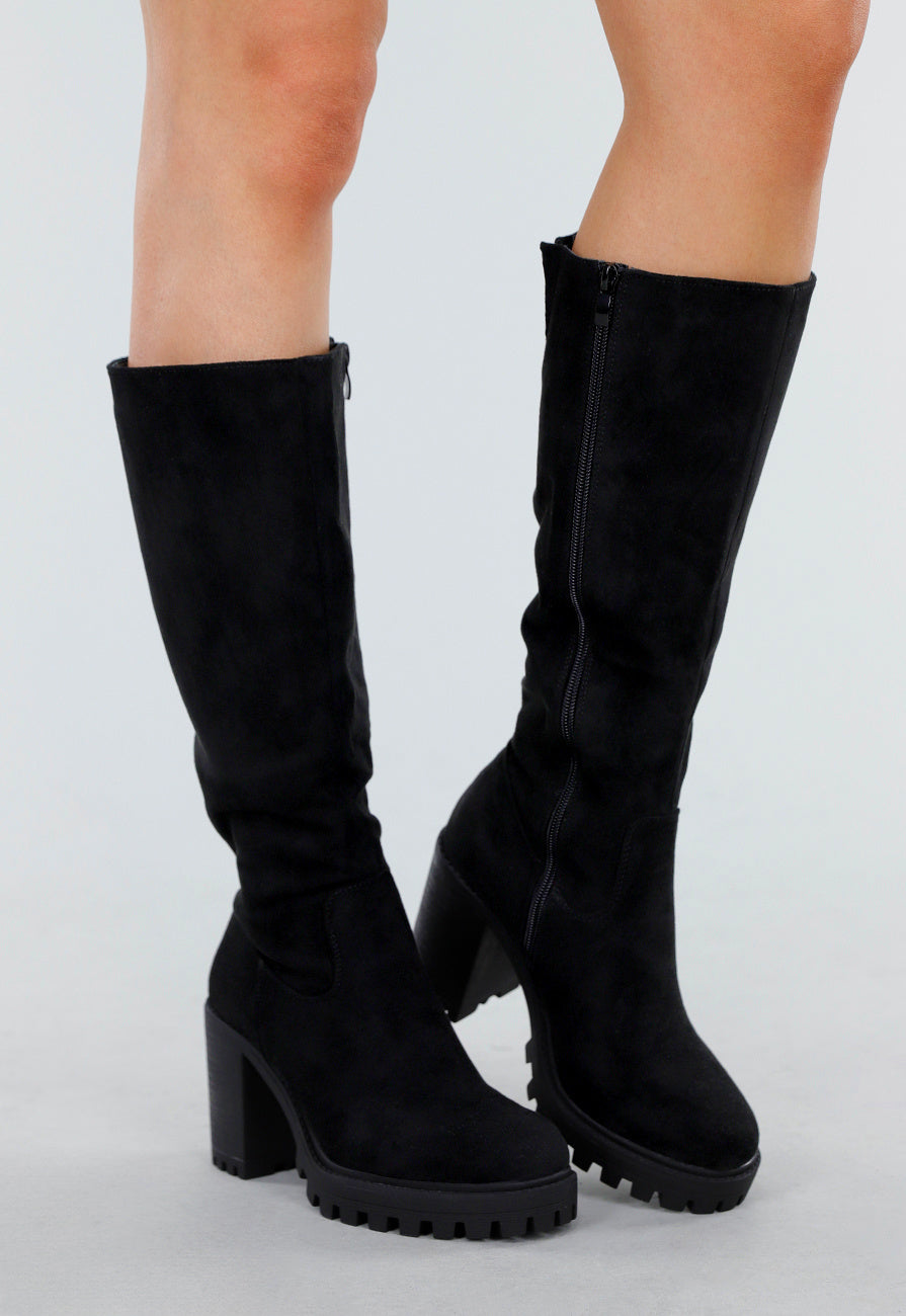 Diese schwarzen hohen Stiefel sind aus einem Material in Wildlederoptik gefertigt. Die Stiefel haben eine runde Schuhspitze und einen stabilen Blockabsatz mit klobiger Profilsohle in Schwarz. Der Schaft reicht bis knapp unter das Knie und hat einen geraden Schaft. An der Innenseite befindet sich ein Reißverschluss zum einfachen An- und Ausziehen. Das Design kombiniert einen eleganten hohen Absatz mit einer robusten Sohle für zusätzlichen Halt.