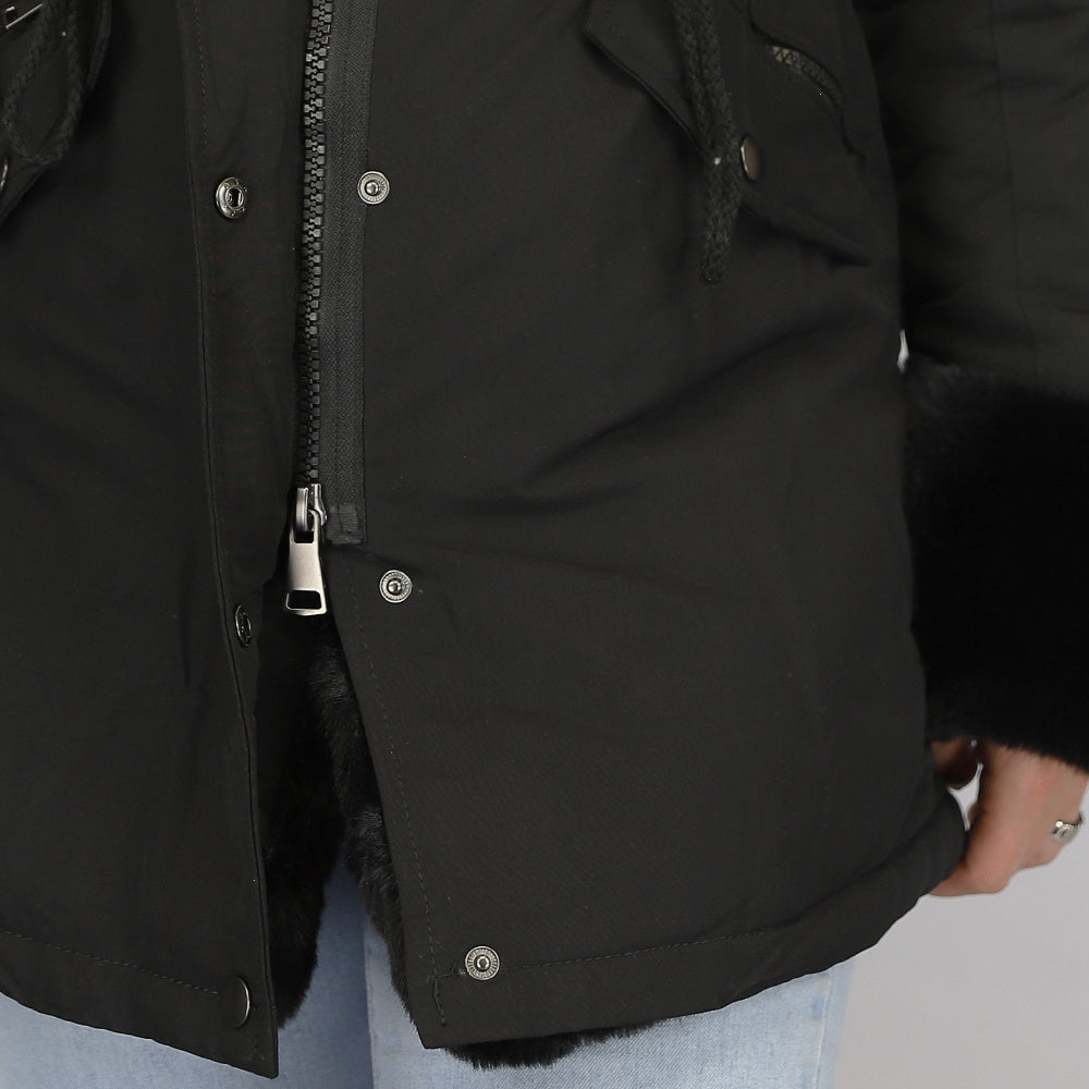 Schwarzer Pelz-Wintermantel mit Kapuze