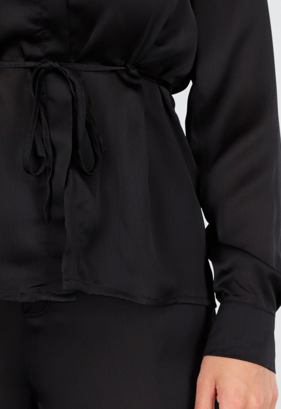 Dieses schwarze Set besteht aus einer Bluse mit Kragen, Knopfleiste und Schleifengürtel in der Taille, kombiniert mit einer locker fallenden Hose mit weitem Bein. Die Bluse ist leicht tailliert und hat lange Ärmel mit Manschetten. Die Hose ist hoch tailliert und hat einen elastischen Bund und einen Kordelzug. Beide Teile sind aus einem glatten Stoff mit dezentem Glanz gefertigt.
