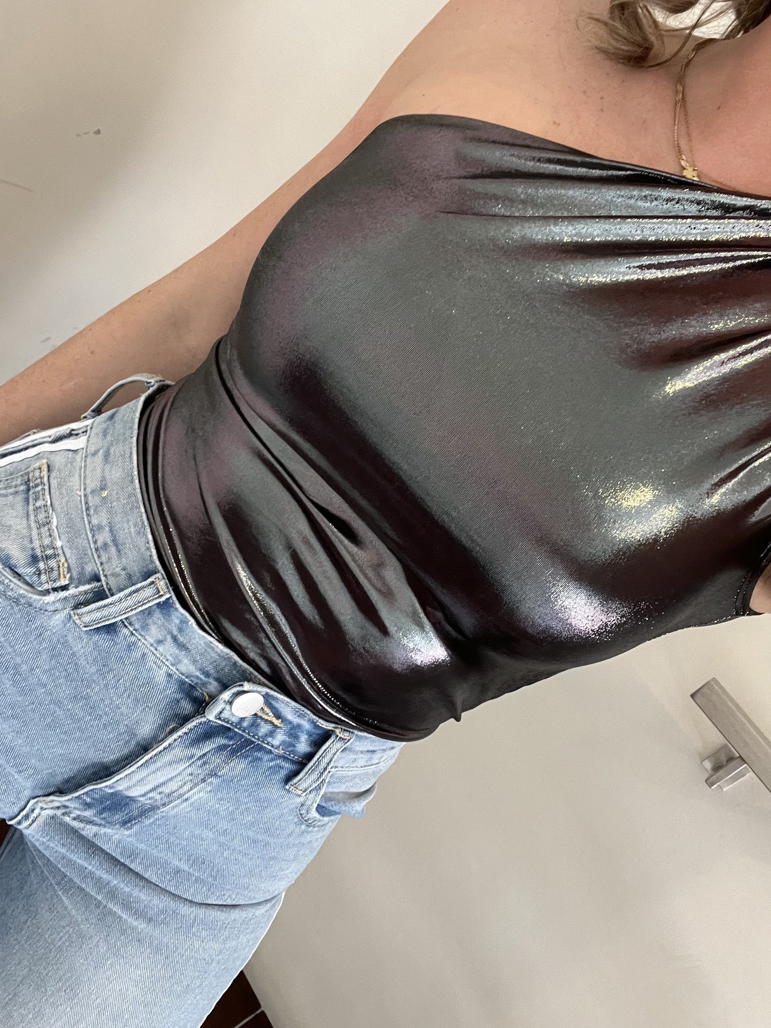 Der silberne holografische Metallic-Body hat eine Schulter und ist in Falten gelegt. Das Unterteil fällt auf halber Höhe zwischen den Pobacken und hat unten einen Druckknopfverschluss, der aus drei Druckknöpfen besteht. Siehe Video für den bewegenden Effekt. Dieser Body leuchtet schön bunt.