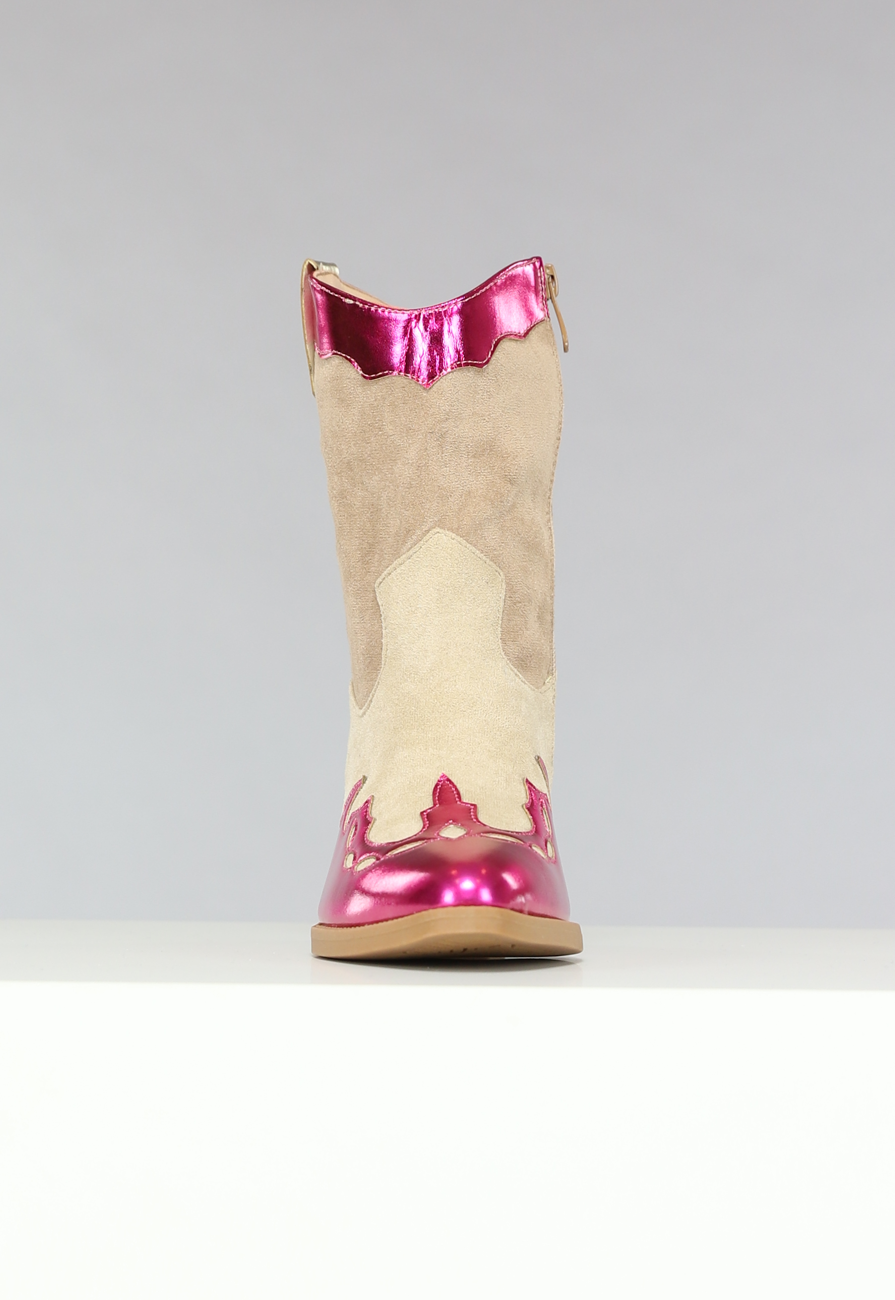 Diese Cowboystiefel in Wildlederoptik haben eine stilvolle spitze Spitze und einen schrägen Blockabsatz in Holzoptik. Man muss von oben einsteigen und da der Schaft etwas breiter ist, geht das ganz einfach. Die Stiefel sind oben abgerundet und mit rosa Metallic-Details versehen.