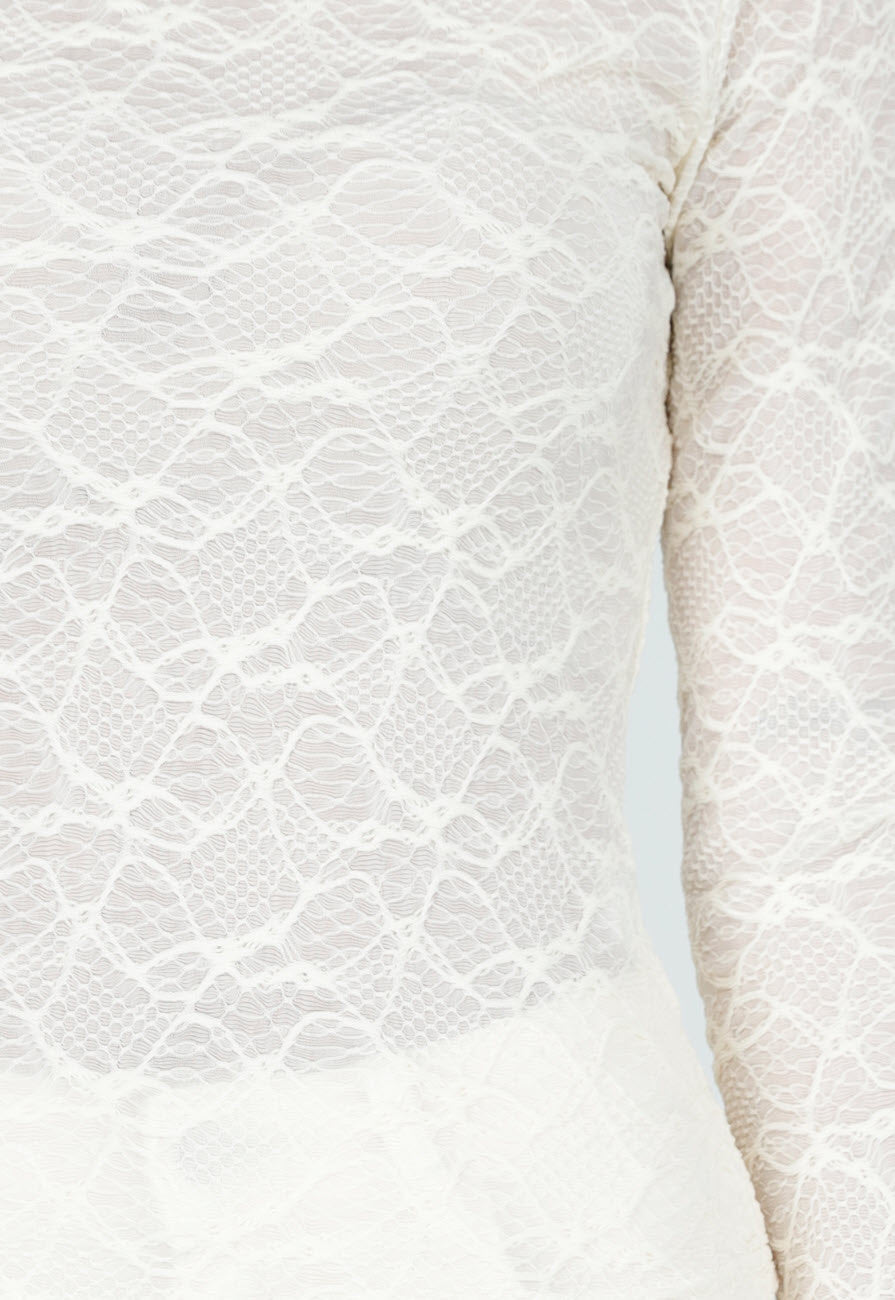 Dieses cremefarbene Oberteil ist aus transparenter Spitze mit einem dezenten Wellenmuster gefertigt. Das Modell hat einen hohen Ausschnitt und lange Ärmel. Der Stoff ist leicht durchscheinend und hat eine leichte Struktur.