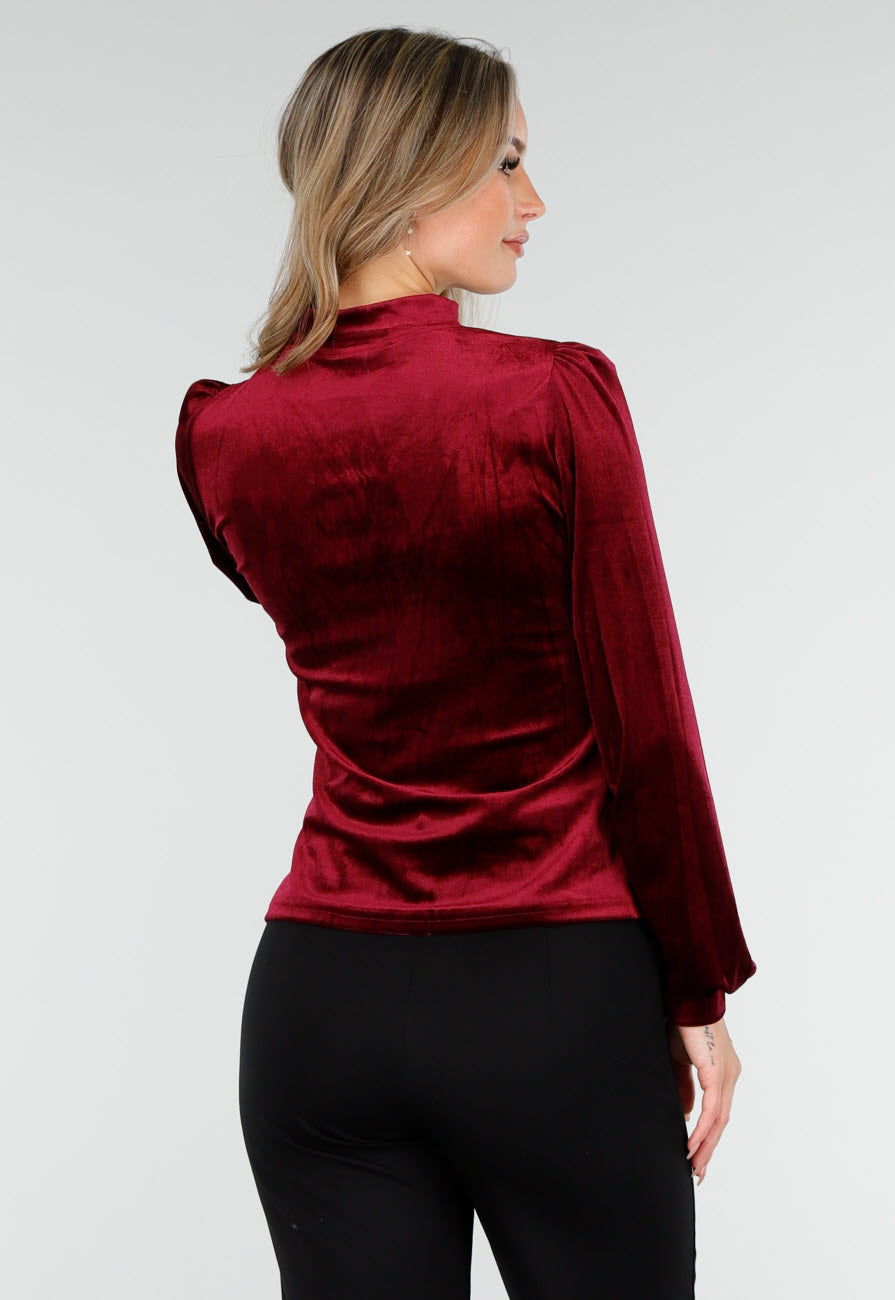 Dieses rote Oberteil ist aus weichem Velours mit einem dezenten Glanz gefertigt. Das Oberteil hat einen V-Ausschnitt, kombiniert mit einem festen Choker-Band um den Hals, was für ein besonderes Detail sorgt. Die langen Ärmel sind an den Schultern leicht gepufft und mit einem schmalen elastischen Rand am Handgelenk versehen.