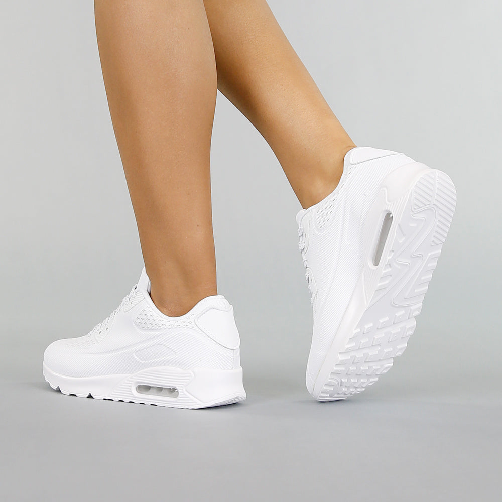 Stichworte: niedrige weiße Turnschuhe, Turnschuhe in Lederoptik mit Luftsohle, dicke Sohle, Basic, schlicht, Tupfenmuster