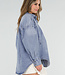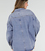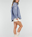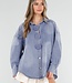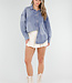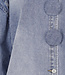 Blaue Bluse aus Denimstoff mit Kragen und langen Ärmeln. Die Bluse wird vorne mit Knöpfen geschlossen und hat drei auffällige Oversize-Knöpfe als Detail. Die Passform ist locker und der Rücken ist etwas länger.