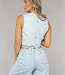 Dieses niedliche Oberteil ist aus einem Denim-Stoff gefertigt. Es hat einen kurzen Schnitt und ist ärmellos. Es hat einen tiefen V-Ausschnitt mit einem Umlegekragen. Um die Taille herum befinden sich zwei Bänder, die auf verschiedene Weise gebunden werden können. Sie können zum Beispiel eine Schleife auf der Vorderseite machen oder die beiden Träger um die Taille wickeln, so dass die Schleife auf der Rückseite ist. Das Oberteil enthält keinen Stretchanteil. Es ist Teil eines niedlichen Sets.