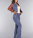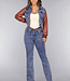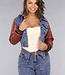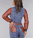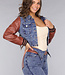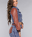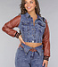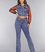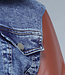 Dieser Zweiteiler ist aus einem Denim-Stretch-Stoff in Kombination mit Kunstleder gefertigt. Er hat ein langärmeliges Oberteil und ist mit einem umklappbaren Kragen ausgestattet. Die Ärmel sind aus einem braunen Stoff in Lederoptik mit dehnbarem Rippstoff mit schwarzen Streifen an den Enden. Das Oberteil hat einen Knopfverschluss, der aus fünf Knöpfen besteht. Auf der Brust hat das Oberteil Brusttaschen. Die Hose ist tailliert und hat ausgestellte Beine. Der Bund hat ein einzigartiges Design, das wie ein offener, gefalteter Kragen aussieht, wie beim Oberteil. Das Set wird mit einem passenden braunen Gürtel in Lederoptik geliefert, den Sie dazu tragen können. Natürlich können Sie auch Ihren eigenen Gürtel verwenden.