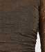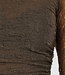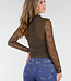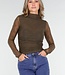 Dieses khakifarbene Top ist aus feiner Stretch-Spitze mit transparentem Blumenmuster gefertigt. Das Oberteil hat einen dezenten Stehkragen und lange, durchsichtige Ärmel. Die Vorderseite ist in einem hellen Beigeton gefüttert und hat einen Drapierungseffekt, der sichtbar über den Bauch fällt. Die Ärmel sind vollständig durchsichtig.