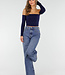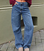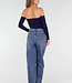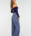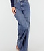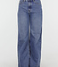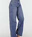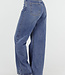 Diese dunkelblaue Jeans hat eine hohe Taille, einen weiten Schnitt und extra weite Hosenbeine. Der Denim hat eine gleichmäßige Farbe mit einer leicht melierten Struktur. Die Hose wird vorne mit einem Reißverschluss und einem Knopf geschlossen und hat einen festen Bund mit Gürtelschlaufen. Auf der Rückseite befinden sich zwei aufgesetzte Taschen. Das Modell fällt von der Hüfte bis zum Saum gerade und weit.