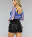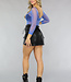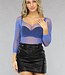Dieser Body hat ein Netzmuster und ein schulterfreies Design. Der Body ist mit einem Netzmuster und Glitzersteinen versehen. Der Body ist tailliert und in der Farbe blau. Außerdem verfügt der Body über lange Ärmel und ein Tanga-Modell. Der Body hat unten keinen Verschluss, lässt sich aber dank des Stretchanteils leicht an- und ausziehen.