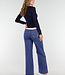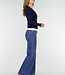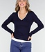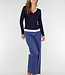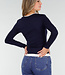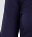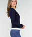 Dieses dunkelblaue, langärmelige Top ist aus einem glatten, dehnbaren Stoff gefertigt und hat einen V-Ausschnitt. Der weiße Saum entlang des Ausschnitts und der Unterseite bildet ein kontrastreiches Detail.