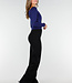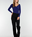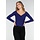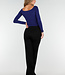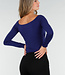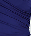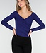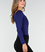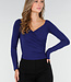 Dieses dunkelblaue Oberteil ist aus einem glatten, einfarbigen Stretch-Stoff gefertigt. Das Oberteil hat eine taillierte Passform mit langen Ärmeln und einer leichten Falte auf der Vorderseite. Der Halsausschnitt verläuft diagonal in einer Überlappung. An der Seite sind feine Raffungen eingearbeitet, die den Stoff leicht nach oben ziehen. Das Material ist geschmeidig und dehnt sich gut.